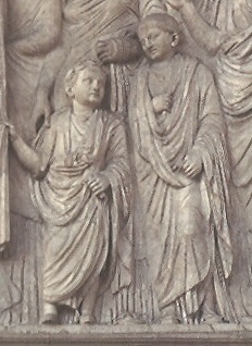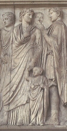 Back in the foreground, the young woman with the uncovered hair and the toddler, along with the man behind her, are usually identified as Octavia’s youngest daughter, Antonia Minor, her eldest child Germanicus, and Antonia’s husband, Livia’s other son Drusus.