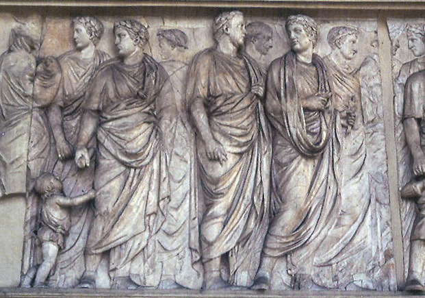 If the hooded man is Agrippa, then it is likely that the woman behind him with her palla over her hair is his wife in 9 BC, Octavius’ daughter, Julia Augusti. Many academics thought for a long time that is might be Octavius’ wife, Livia, who like her husband seems to be absent from the friezes. But at the time of the Ara Pacis’ dedication, Julia wasn’t yet in disgrace, and as the expected future first lady of Rome and mother of the empires’ heirs, she would’ve held higher status than her stepmother. But don’t worry about Liv, I have a theory about where she is, too.