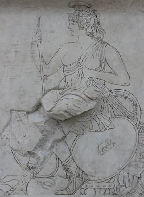 The east side (the back) has two similarly mangled friezes. The right (facing) panel likely depicted Roma, the personification of the city, as a bellatrix, or female warrior. It is thought, again based on similar iconography, that she would have been sitting on a pile of foreign weapons, as a sign that Roma has brought peace by force (by literally taking away her enemies’ means to make war). But as you can see from the picture below, we’re extrapolating all of this from a fragment of the figure’s lap, so you’re probably free to design your own interpretation.