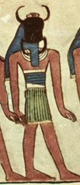 While Atum is seen as the creator of the gods, Khnum is more often associated with the creation of people. He was often saluted as the “Divine Potter,” for it was believed he formed human beings out of the life-giving silt of the Nile flood and molded them on a potter’s wheel. Having thus made people out of the same muck scarab beetles placed their eggs in, Khnum placed the clay children within their mothers’ wombs. In some texts, Khnum is depicted as an ancient king, whose body is made of gold, silver, and lapis lazuli, much in the same way that the Greeks connected the god Hades and the underworld to the mineral wealth that could be taken out of the earth. And it’s this connection to earth and minerals that links Khnum in turn to the Duat and the sun’s descent into the ground (as far as the Egyptians could tell). This version of Khnum in the underworld, blended with Ra, is sometimes called Af or Afu, and he carries the sun in his horns as the Mesektet sails west to east through the Duat.