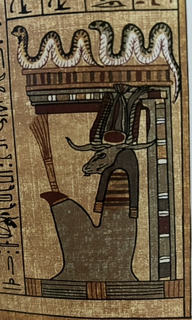 Continuing our idea of non-binary deities, even Budge’s description of Negau can’t make up its mind about whether this is a male or female entity. He calls Negau a “hornless cow”—which is patently false given the picture the Ani text gives, but the goddess’ name is routinely translated as “Long-Horned Bull,” which straightens out the horn situation but abandons the cow part. Again, I think it makes more sense to see Negau as a (cow) goddess; not only because that’s how she’s addressed in the text, but because of her apparent role as a defender of Osiris, who was often hybridized with the Memphis bull god, Apis, who shared the Lord of West and Ptah’s connection to the afterlife. Negau could also be meant to be seen as a connection to the cow goddess par excellence, Hathor, who was known in the Duat as Imentet, “She of the West,” a psychopomp who aided the deceased in the transition between life and death. Cows were considered some of the most important sacrificial animals given to the gods and the yearly Apis bull in particular was seen to ensure the rebirth of Osiris and by extension, the rebirth of the Egyptians following in his wake. This might be how Negau “prevails with knives” and releases the deceased into the protection of the Duat—further emphasized by the row of sun-crowned uraeus cobras guarding the lintel of her portal.