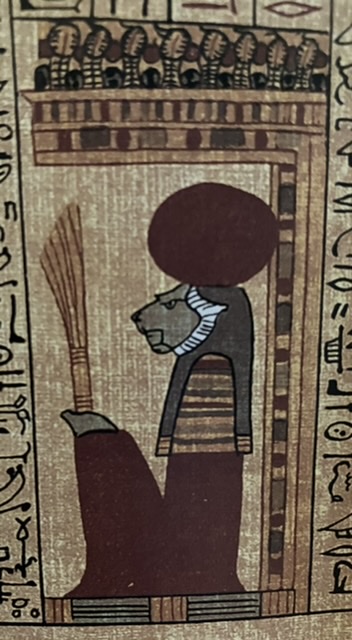 After a fairly straightforward ID on our last guardian, we’re diving right back into gender fluidity as we enter the penultimate portal and we find ourselves with another lion deity. Though unlike Mes-Ptah, Budge and my other translators seem pretty confident that this lion is a dude and that his name is “One Who Made Himself” rather than “One Who Made Herself.” Perhaps because “Arisudjesef” is an epithet of several male gods, including Thoth, Ptah, and Khnum. The ability to bring one’s self into being is a hallmark of creating deities, and makes them powerful defenders of Osiris, a god notable for his dependence on others to bring him back to life. It is possible that this is a callback to aforementioned Ptah/Bastet son, Maahes, who is often shown with protective uraei as this lion guardian has over his portal. But Maahes is also usually depicted wearing Osiris’ Atef crown, whereas this lion(ess) is shown crowned by the sun. But there is an Egyptian lioness goddess thus shown and that is the indomitable Sekhmet, whose sun crown is typically encircled by a uraeus cobra as well. “Lady of Strength,” an epithet in the spell text is a common one for the goddess and in Upper Egypt, she often replaced her sister Bastet as the wife of Ptah and the mother of Maahes. And it is Sekhmet’s domain in Upper Egypt, the deserts of the south, where the precious feldspar is found that the unnamed lady of the spell wears. The protective war goddess without equal’s shadow is easy to imagine in the halls of Osiris guarding him as much as that of Bastet in another doorway.