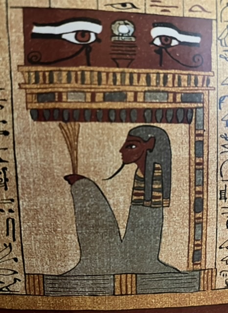 Ah, see, here again we see a reference to Abydos as a terrestrial home of the Egyptian gods. We also see, although she is addressed as a lady, that Sebaq has all the appearances of a man, including typically darker skin and a false beard. This leads Budge to label the guardian as a man despite the way the spell acknowledges them, but I’m less sure. Sebaq is called “the mighty lady” in the text, so what we might be seeing in their depiction is a female goddess arrayed in the traditional trappings of power that would have been understood by the Egyptians, i.e., male authority. Her masculine appearance is a way to use visual language to illustrate her strength, just as Hatshepsut would have herself dressed in a man’s kilt and false beard to demonstrate her authority as pharaoh outside of her biological sex or chosen gender. The hieroglyphs above Sebaq’s portal also support this intersex or non-binary reading, I think, because they are symbolic of both opposites and absolutes. The two wadjet eyes are meant to represent the sun and the moon encompassing hieroglyphs for eternity, water, and vase. The water-glyph is doubled here, generally used by Egyptian to indicate quantity, which makes it likely that this is meant to refer to the Nile, particularly since the river is mentioned in the portal spell. The vase might seem more puzzling, but as we talked about last week, certain versions of Osiris’ cult worshipped him as a burning vase—an “eternal flame,” if you will. Just as Nerwyt is both a means of forbiddance and entry, and Mes-Ptah is connected to both birth and death, Seqab demonstrates the totality of the cosmos: goddess and god, sun and moon, life and afterlife, the Nile’s capacity for creation and destruction; all symbolized by the glyph for infinity/eternity.