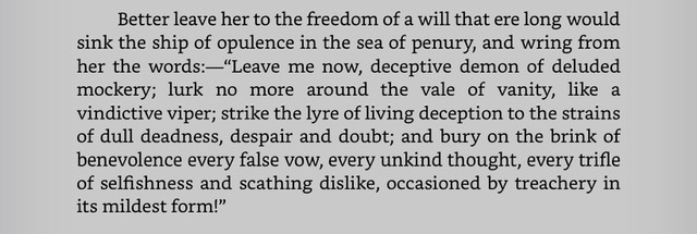 But before you start feeling too bad for Ros, know that a lot of this critique seems to have been water off a duck’s back to her. Completely undaunted, she went on to write two other novels and two poetry collections in addition to Iddesleigh. She was comfortable in her style and was certain that she would “be talked about at the end of a thousand years.” She believed herself to have millions of admirers and considered the critics stymied by her dense prose and whiplash plots as too stupid to appreciate her genius. And signaling that she too shared some of my suspicions as to where some of her criticism was coming from, claimed that the upper classes were trying to silence her from using her stories to reveal their moral turpitude. Which is sort of the theme of Irene Iddesleigh, if the novel can lay claim to an overarching theme.