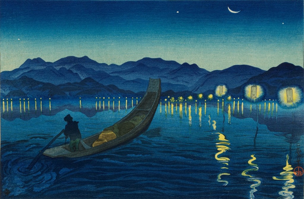 [Catching Whitebait at Nakaumi, Izumo (Izumo nakaumi shirauo tori) (1924), Oda Kazuma; Watanabe Shozaburo, publisher. As you’ve probably guessed from this print’s traditional subject matter and by having a publisher credited, Oda Kazuma is working in the shin-hanga school. This is a good example of how shin-hanga is somewhat different from ukiyo-e, though, as you can see Oda playing with more western ideas of light and shading than perhaps more traditional techniques. Compare this print with Van Gogh’s Starry Night Over the Rhône (1888) below👇]