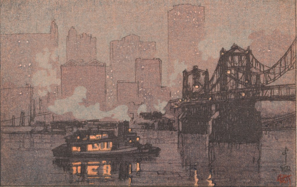 [Evening in Pittsburgh (Pittsubaagu no yu) (1928), Yoshida Hiroshi. The Yoshida family is an example of how artistic traditions are still often passed down genealogically in the Japanese arts. Arguably beginning with Yoshida Kasaburo (1861-1894), a ukiyo-e artist, Hiroshi (1876-1950) was both adopted into the family and married into it. He and his wife, Fujio (Kasaburo’s daughter) would carry the family through the shin-hanga era, and their sons and daughters-in-law continue to do likewise into the sōsaku-hanga era. An extensive traveler, Hiroshi is famous for his Japanese-style prints of non-Japanese landscapes. Here, understandably, CMOA is proud to display a print he made of downtown Pittsburgh. The bridge depicted here is an earlier version of the Seventh Street Bridge (the Andy Warhol Bridge), which was torn down shortly after Hiroshi’s visit and replaced with the current iconic yellow suspension bridge.]