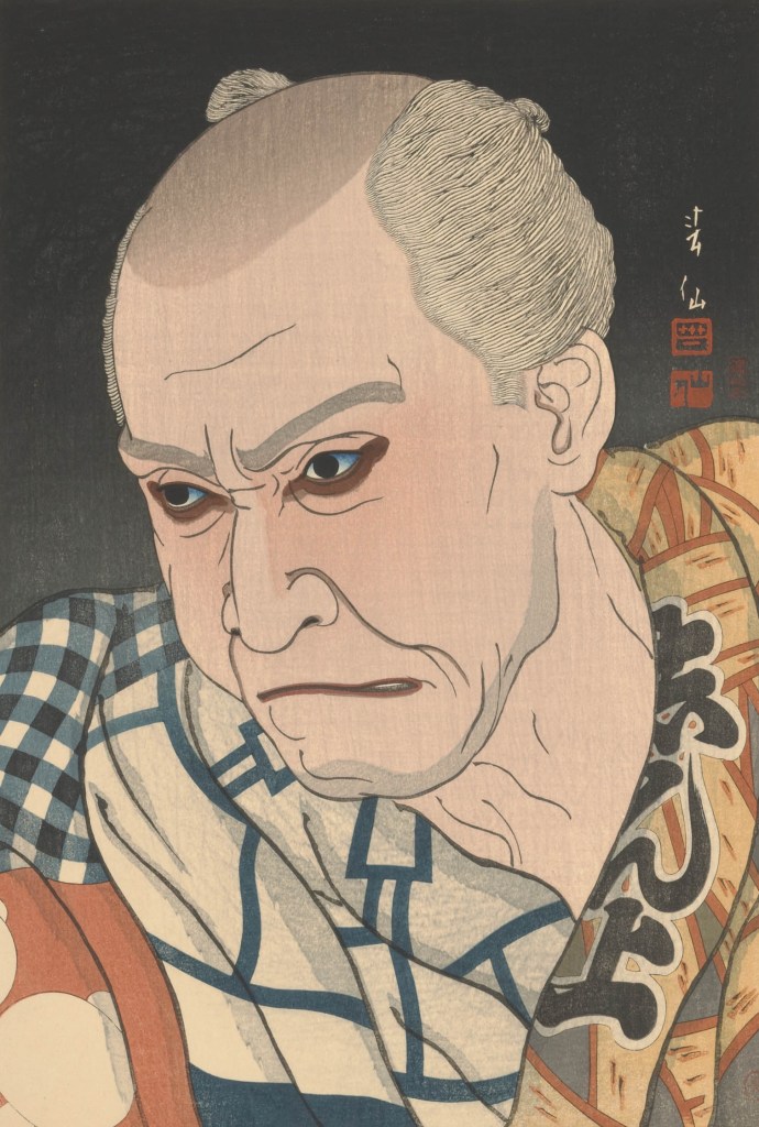 [Star Wars: Dark Lord Fallen Nest (2017), Ishikawa Masumi. Here, in perhaps a lighter vein, Ishikawa Masumi takes another traditional ukiyo-e subject, the kabuki actor portrait (yakusha-e), and adapts it to depict Stars Wars villain Darth Maul. Compare this sōsaku-hanga print to a yakusha-e-style shin-hanga print by Natori Shunsen from earlier in the exhibition and a traditional ukiyo-e print from Tōshūsai Sharaku below👇]
