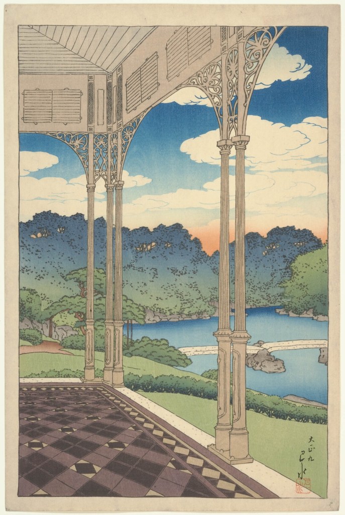 [The Garden Viewed from a Western Style Building (Vokan yari teien o nozamu) (1920), Kawase Hasui; Watanabe Shözaburo, publisher. Another Watanabe Shozaburo-published shin-hanga print, this one by Kawase Hasui, one of the most prolific artists of the movement. Here, we see a very ukiyo-e-like landscape, but with the modern twist of the presence of a western-style veranda, as opposed to a more classical Japanese vista with perhaps a pagoda.]
