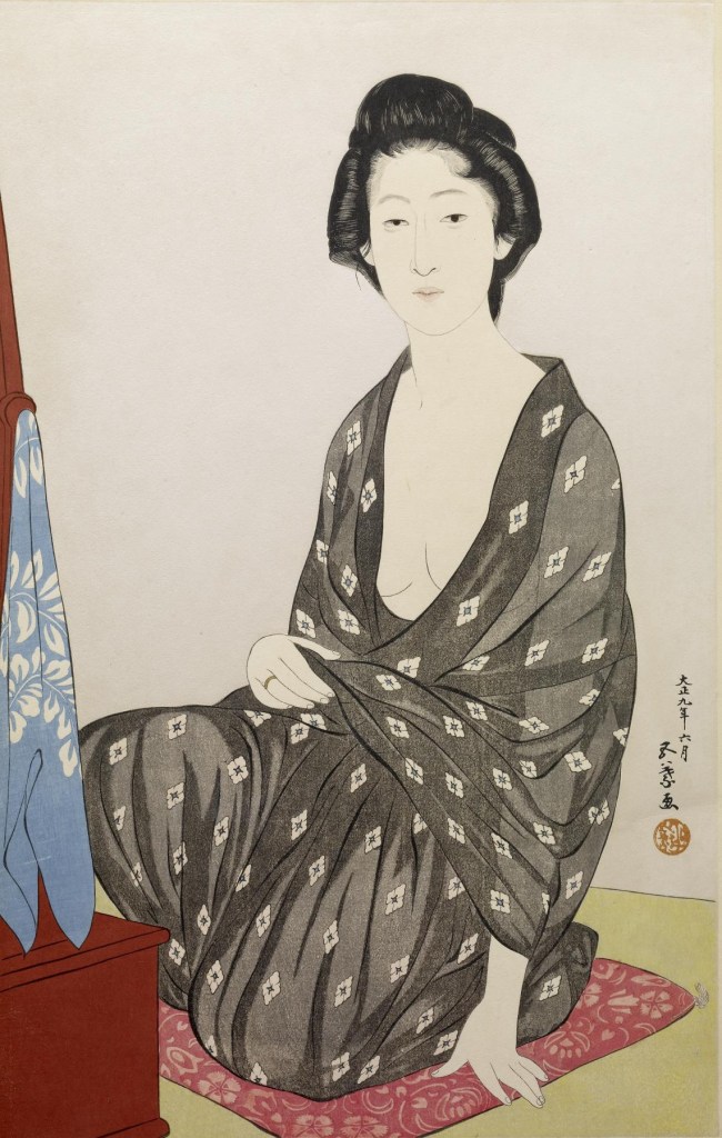 [Woman in a Summer Kimono (Natsui no onna) (1920), Hashiguchi Goyō. Here is a good example of how shin-hanga blended western influences with traditional ukiyo-e subjects, more specifically, with the bijin-ga women’s portraits. Compare this print to Torii Kiyonaga’s ukiyo-e print Bathhouse Women from the late 18th century, or Édouard Manet’s Le Déjeuner sur l’herbe (1862/3) below to see the mixture of techniques and influences👇]