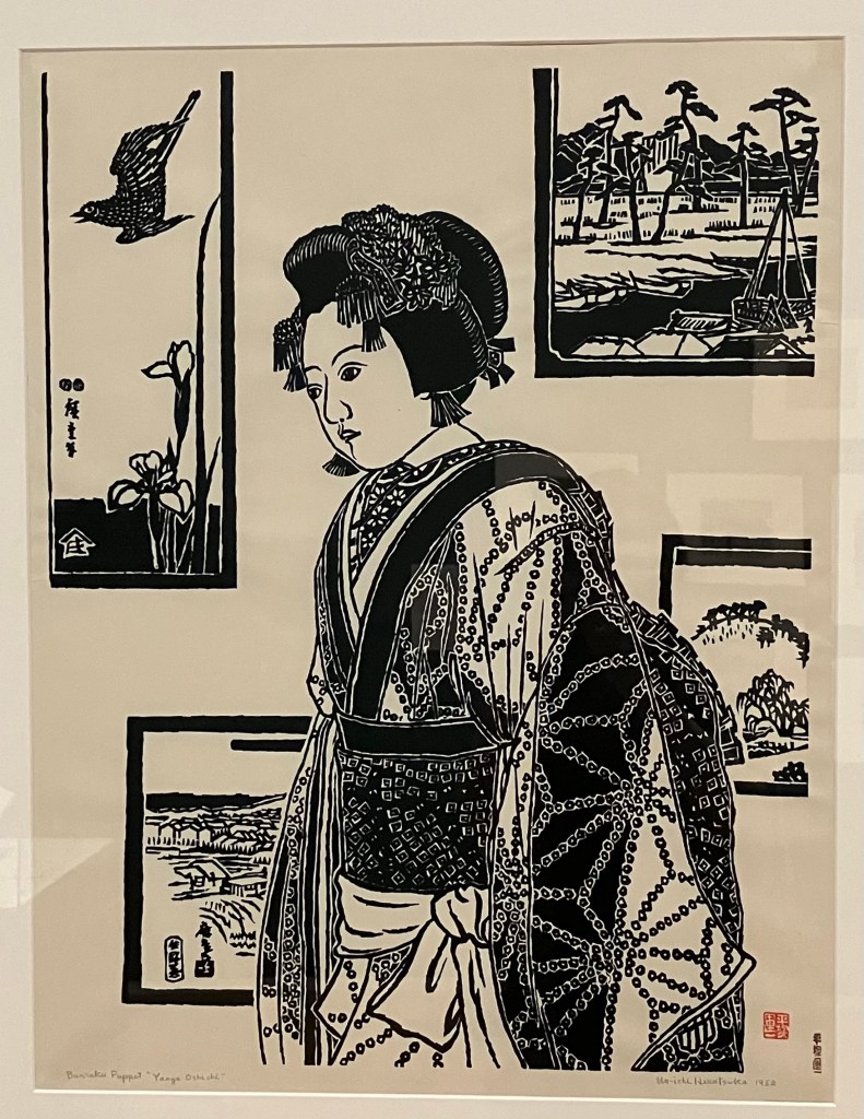 [Bunraku Puppet “Vaoya Oshichi” (1952), Un’ichi Hiratsuka. With Un’ichi, we begin to move away from shin-hanga into sōsaku-hanga. He was a pioneer of making modern ukiyo-e prints in simple black and white—a style so copied by his students and adjacent Japanese artists, so quintessentially “Japanese,” that I assumed it was coming from an early established tradition. Almost recalling free-handed pen and ink drawings, Un’ichi was trying to give the plain white spaces of his woodblocks the same dynamism that the pre-Meiji artists used color for in their compositions. Degas does something similar in his black and white drawings of fellow artist Mary Cassatt walking the Louvre below👇]
