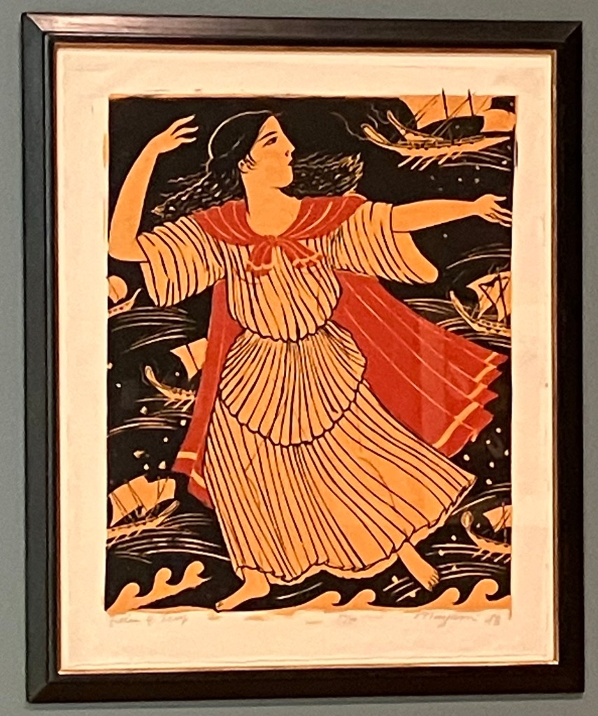 [Helen of Troy (1978), Oda Mayumi. Here we have sōsaku-hanga taking on a thoroughly western subject, the mythological heroine Helen. Oda uses Japanese printing to mimic the red-figure pottery technique of ancient Greece. Compare her Helen to the Helen on the krater below from the 5th century BCE👇]