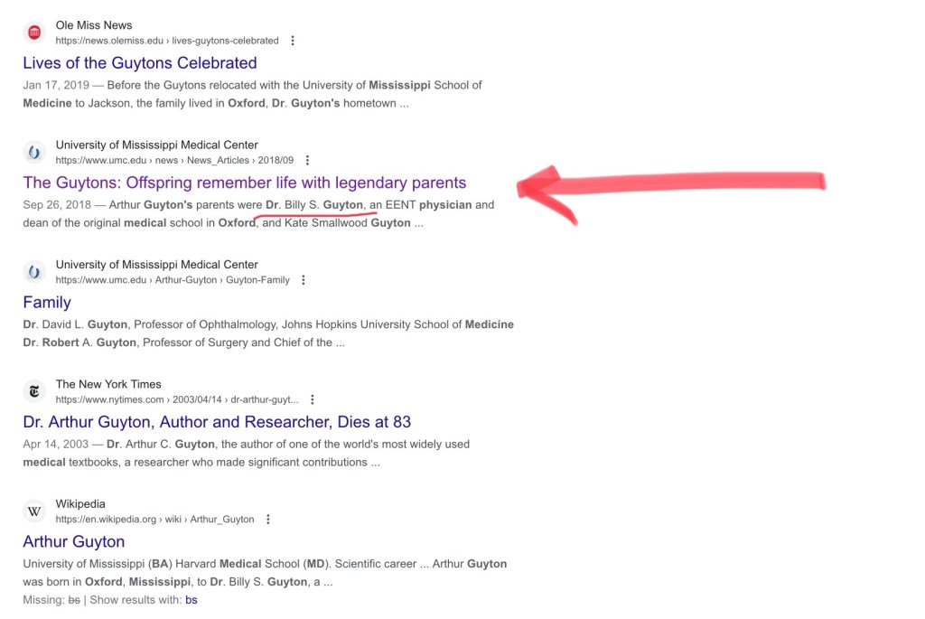 One of my lesser talents is that I’ve always been a pretty savvy Googler. That used to be fairly standard in my eyes, but as the general search quality continues to decline on the engine, having some skills is sometimes the only way it’s still useable. That said, in this case, I didn’t do anything special to start, just typed in “B.S. Guyton MD Oxford Mississippi” to see if anything came up. To my disappointment, the top result was a familiar name, but not my B.S. Instead, it was Dr. Arthur Guyton, a world-renowned physiologist whose name I remembered from my Wikipedia search results.