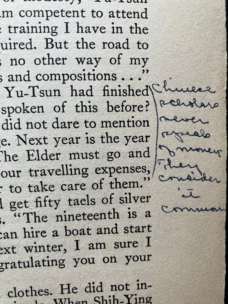 To cut the suspense short, in this I was largely to be disappointed. Not that the previous owner was a philistine or anything—far from that. It was rather that their scattered notes were more focused commenting on the socio-cultural aspects of Red’s story, rather than the literary, which would have been more my personal speed. But I was intrigued that these few observations were made with a certain tone of familiarity and authority in regard to Chinese customs, which made me curious as to the background of the previous owner. And it was that mild curiosity that sent me headlong down a truly wild rabbit hole—a rabbit hole that I want to share with all of you.