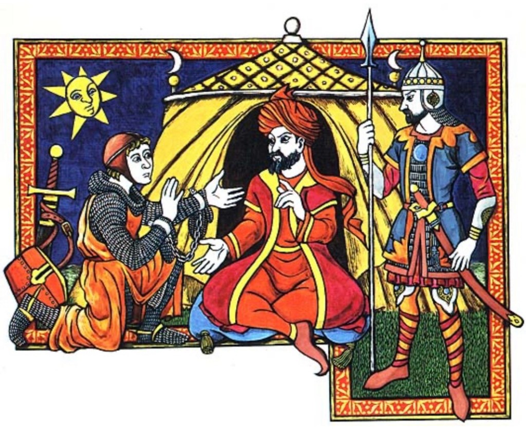 The original story in Ordene de chevalerie is a little more grounded in the mores of the twelfth century, with Hugh being Hugh II of Tiberias (stepson of Raymond of Tripoli for my readers), so a local Frankish baron rather than a European crusader. In the poem, Hugh, at Saladin’s request, instructs him in the tenets of knightly chivalry, but refuses to officially name him a knight because he says it would be a “wickedness” (L’Ordene de Chevalerie, Busby trans., p. 172) for him to perform the final requirement—that the ordaining knight, Hugh, strike the face of Saladin. The traditional blow was meant to remind the ordainee both of the valor of the knight who called him to knighthood and of the seriousness of the vows he had made, but Hugh believes that it would be wrong for him to take such a position over the sultan, both because of Saladin’s social standing as a king and as Hugh’s captor, who must needs have power over him. There is also some cultural subtext that, as a Muslim, Saladin can never truly be a full knight, hence the ordination never being completed. Despite this, Hugh asks Saladin to pay his ransom and here we have the intersection with the Kimmel story, with the sultan having his emirs collect the money, plus more for Hugh as a gift.