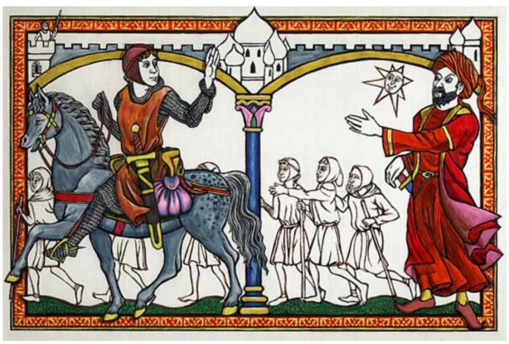 But both the more medieval L’Ordene and its modern reworking by Kimmel are very representative of an entire genre of stories that sprung up around Salah al-Din following his capture of Jerusalem in 1187 and the subsequent Third Crusade (1189-1192). You would expect medieval western literature (and the literary traditions that followed it) to turn the Muslim warlord who conquered most of the Holy Land and took its most revered city away from Christendom to be portrayed like a thirteenth century Osama bin Laden, but in fact, something much more interesting happened: rather than becoming an Antichrist, Salah al-Din became a hero of chivalric literature. Arguably one of the greatest heroes of the genre alongside Roland, Arthur, and Richard of England.
