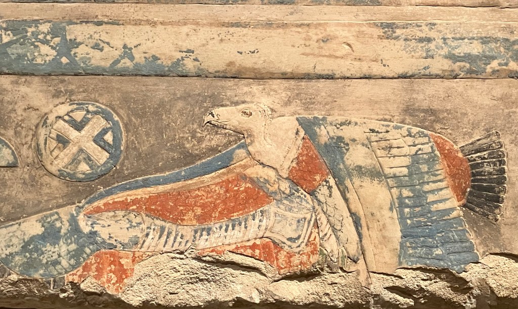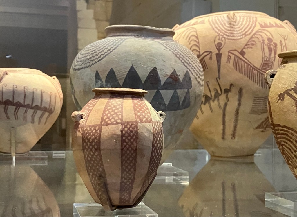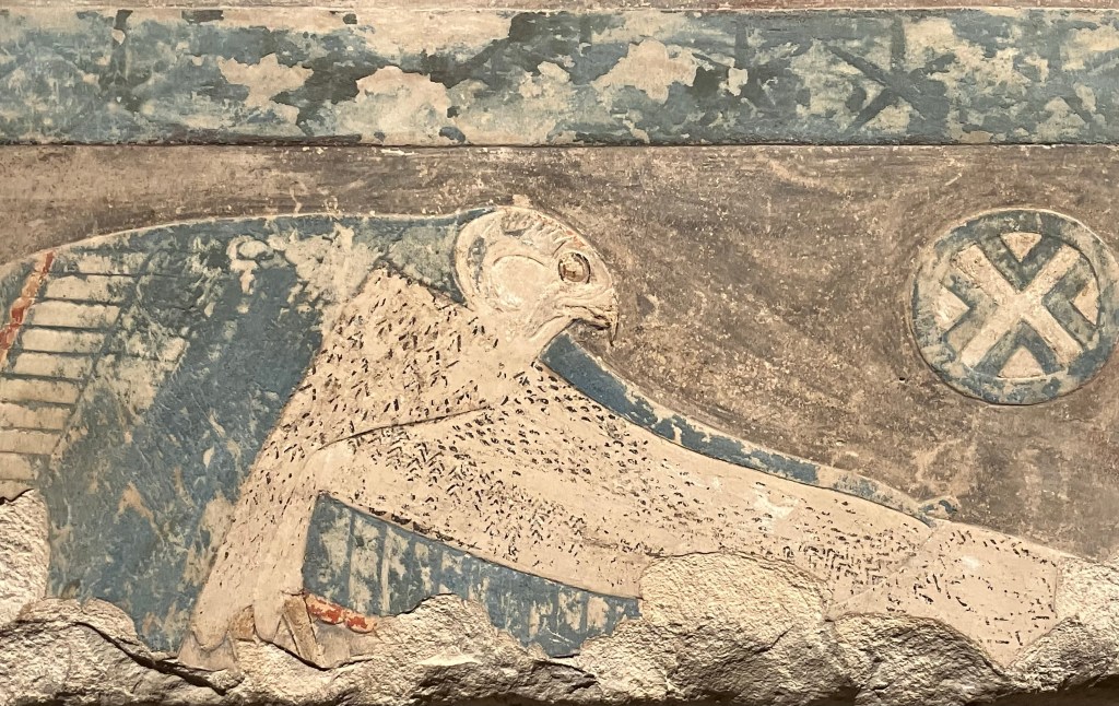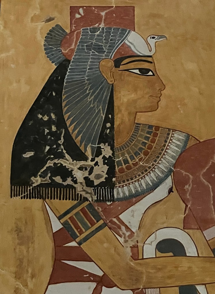 While not the flashiest objects in the wing, the Met has a large collection of pottery from the predynastic Naqada periods of Egyptian history, when the earliest Egyptian cultures were centered in Upper Egypt around the horseshoe bend in the Nile above Thebes. This period and its artifacts always interest me because Naqada is the Arabic name of the Egyptian city of Nebut/Nebyt, better known to my readers in Greek as Ombos, the place where all my God’s Wife protagonists end up congregating in. By the late Ptolemaic period/early Imperial period of my books, Naqada is barely more than a village, but in the predynastic era, it was one of the earliest major Egyptian cities and the main cult center for the god Set during the time he enjoyed his most widespread worship. On the largest pot above (second from the right), you can see a depiction of another major predynastic deity, the goddess Bat—recognizable by her arms curled over her head in a gesture meant to resemble cow’s horns, as she was a celestial cow goddess. During the Middle Kingdom (2040-1782 BCE), Bat would be integrated with Egypt’s other cow goddess, Hathor, and her separate worship would largely cease. But you can usually pick out a depiction of Bat from Hathor not only by the date of an object, but because Bat’s “horns” will curve inward, while Hathor’s curve outward. Some scholars speculate that this might reflect a change in the breeds of cow being raised in Egypt between the Naqada Period and the Middle Kingdom.