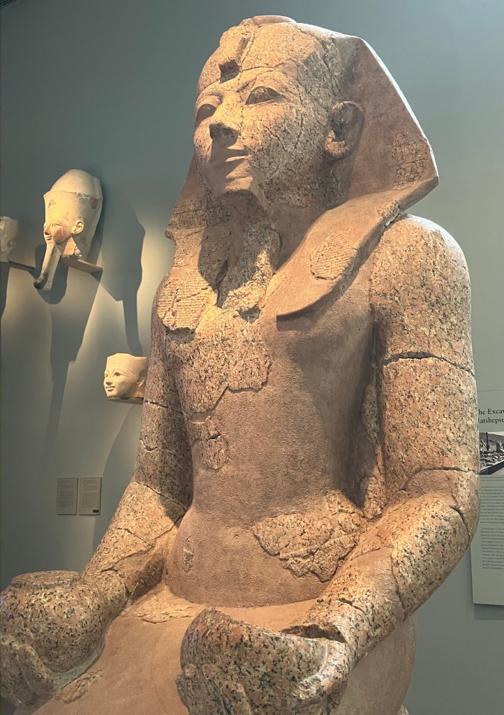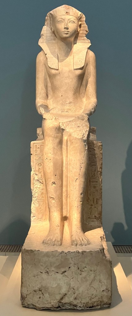 Here is another statue of Hatshepsut in granite holding libation jars, where you can see the remains of a false beard, and a more ambiguously-presenting chest and face. In the background, you can see a limestone head of the pharaoh where she has the full false beard and wears the the double pschent crown, but with a facial profile much more similar to the limestone sculpture. This fluid approach to depicting the pharaoh continued throughout her reign, with the more feminine depictions likely coming later in time as the Egyptian power structure became more comfortable with first a woman regent, then an outright monarch.