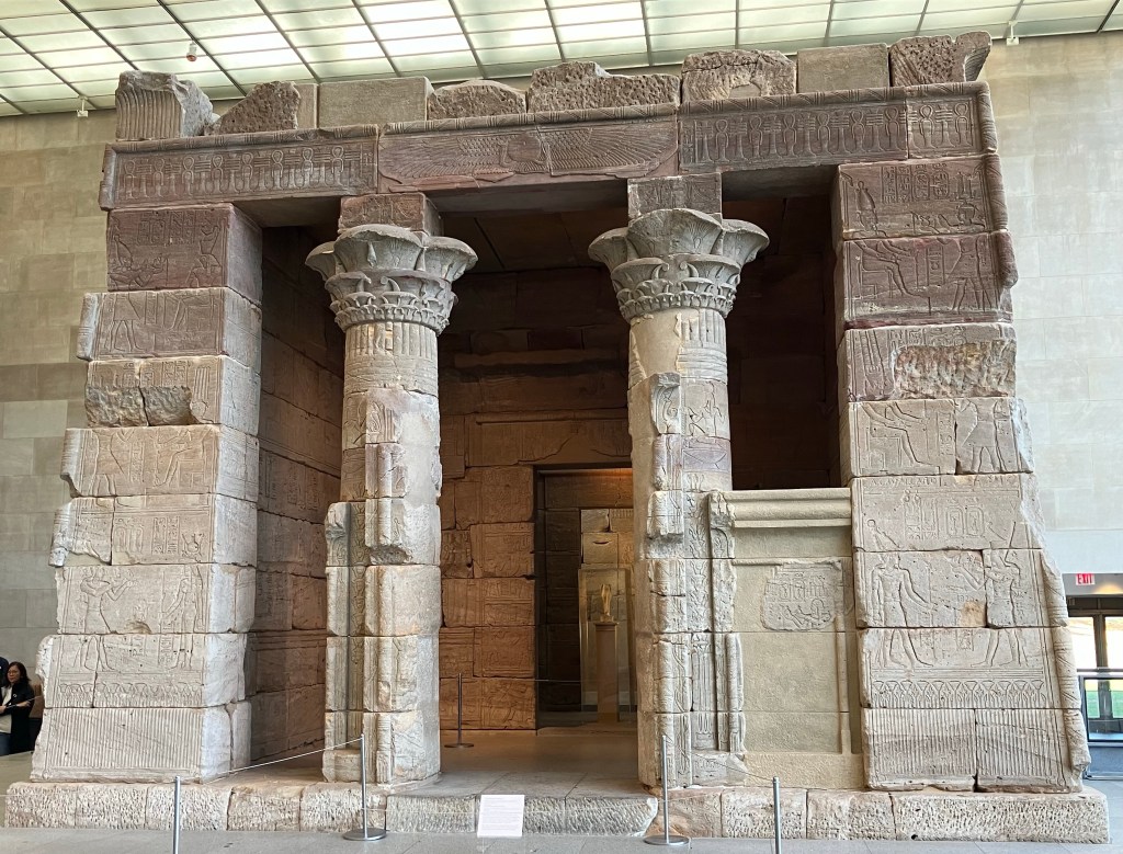 As we briefly talked about in my entry on lesser-known Egyptian gods, which to this day remains my most popular entry ever (#2 Google result for “weird Egyptian gods”!), the Temple of Dendur was built by Gaius Petronius, Roman praefect of Egypt, on Octavius’s behalf in Dendur, Nubia to honor a local cult to a pair of deified twins, Pedesi (Peteese) and Pihor. Taking a little over a decade to build, likely due to its relatively remote location in Roman Egypt, the small temple was a gift from the modern Egyptian government to the United States in order to preserve it from being submerged in the reservoir of the Aswan Dam in 1965. After a brief consideration as to where to put it, the temple was awarded to the Met by President Johnson. The temple consists of 661 individual limestone blocks and pylons that were disassembled for transport and reassembled in New York, where architects Kevin Roche and John Dinkeloo designed a new gallery wing at the museum to hold it. The large, airy room that houses the temple was meant to simulate its original outdoor location, while protecting it from further weathering.