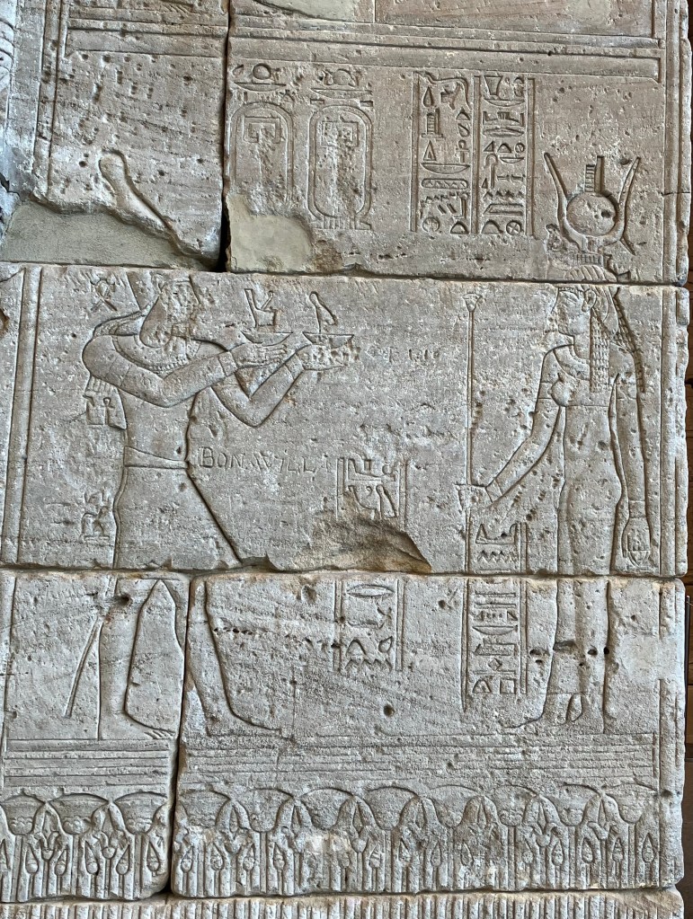 Here we can see the previous Isis panel in situ on the lowest part of the wall, and above it on the center panel, Octavius sacrificing to Mandulis (Merul/Melul), a local Nubian god that didn’t enter the Egyptian pantheon until the Roman period. On the pylon to the right, you can see Heh, the Egyptian god of infinity.