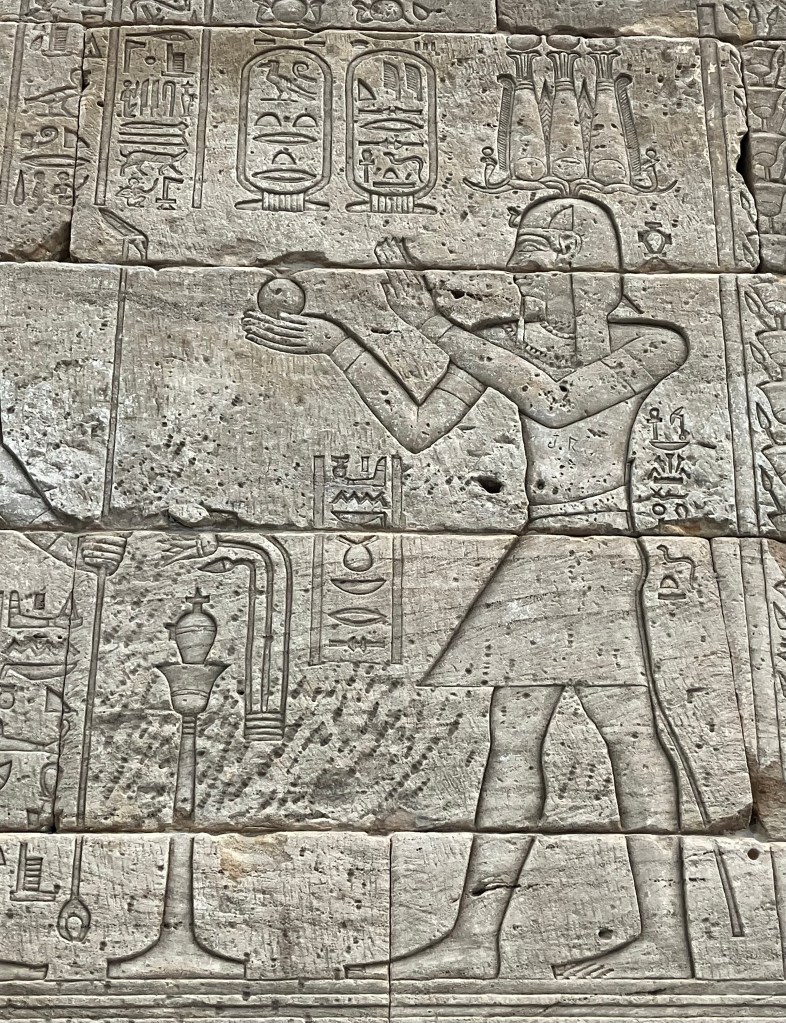 And for variety, on this wall Octavius wears the elaborate hemhem crown above the pharaonic nemes head cloth—a triple atef crown atop ram’s horns and flanked by two uraei as symbols of protection. Hm in Egyptian means “to shout” or to cry out, so with classic Egyptian doubling for emphasis, “hemhem” suggests prolonged shouting, perhaps in imitation of a battle horn. The hemhem was a relatively late-arriving crown popular among the Nubian pharaohs of the 8th century BCE and the Ptolemies, but it was also the favored crown of Heka, the godly personification of magic. Here, Octavius might be using it to advertise to the locals that he possesses the ruling words of power (literally what hka means) which support his rule of Egypt and therefore his ability to make fruitful sacrifices to the gods on their behalf.