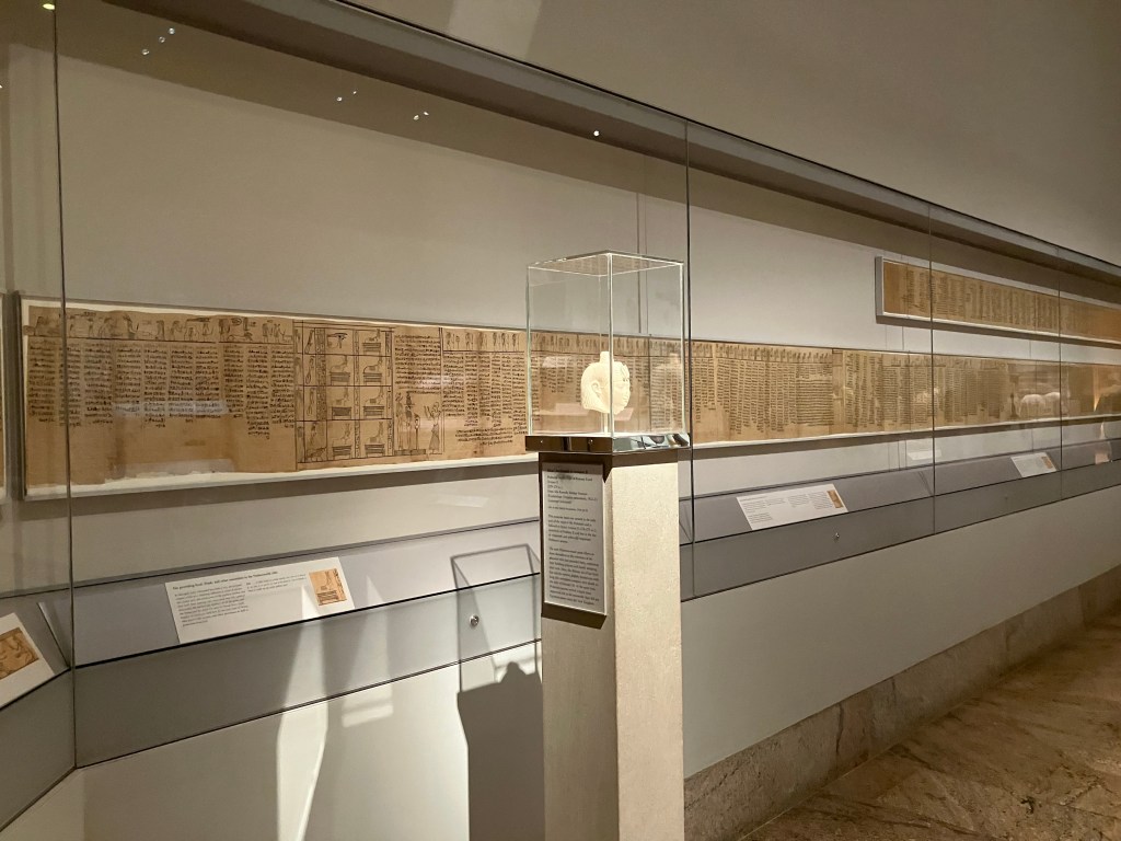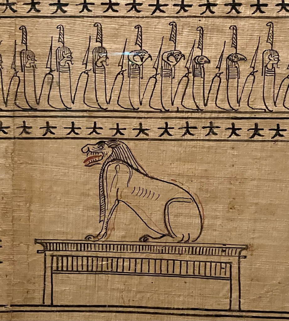 The museum also has a Ptolemaic era copy of the complete Book of Coming (Going) Forth By Day (The Egyptian Book of the Dead), which they display stretched around the perimeter of their main solo Ptolemy gallery. Below is a detail showing Amit the Devourer.