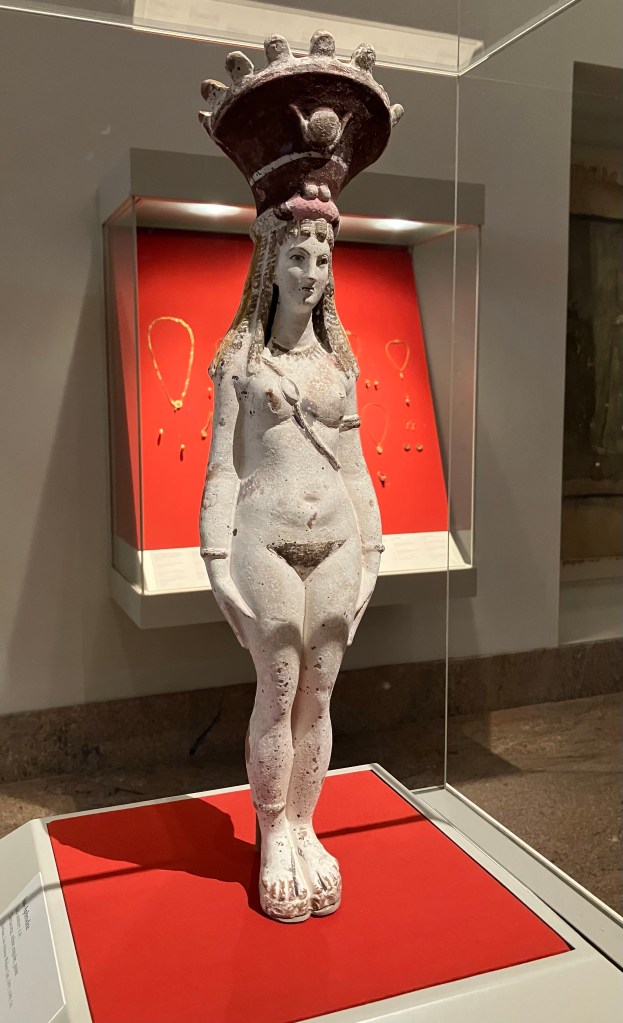 One that is relatively famous is this terracotta statue of a syncretic Isis-Aphrodite from the 2nd century CE, where the artist combines the rigid pose of Egyptian art with the sacred nudity of the Greco-Roman goddess. This blended deity wears her hair in hanging braids like an Egyptian, but their blonde color is decidedly not Egyptian. On the front of her elaborate headdress, though, you can also see the horned sun symbol of Isis.