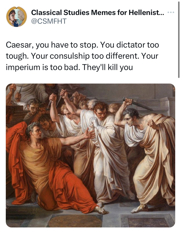 Despite its title, the main focus of Ides is actually on the disastrous Bona Dea festival that led to Julius’ divorce from his second wife, Pompeia. Unlike Hurston setting out to correct what she saw as a biased historical interpretation, Wilder is consciously fictionalizing his ancient records. He follows the general tenor of his sources, but he purposely moves the Bona Dea incident up in the timeline from 62 BCE to just before Caesar’s death in 44 BCE. He also resurrects many characters who would be alive for the early event but not the later, like Cato and Catullus, as well as Caesar’s Aunt Julia, who was historically dead for both. This drove some more academic critics crazy, but Wilder was upfront in his note at the beginning that the novel is a “fantasia,” rather than hard historical fiction. This sense of unreality is heightened by the fact that sometimes the letter timeline shifts back and forth in a nonlinear fashion, so characters’ perceptions are in constant flux. Again, this is an irritant to some readers, but I think these are the kinds of interesting choices you can make as a writer when working in such well-trodden ground. We can go back and forth in time because it ultimately doesn’t matter—we know the Ides are coming and everything leading up to it will ultimately be swept away by its fallout.