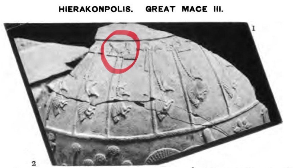 [Part of the Scorpion Macehead, with an animal standard that, again, bears a resemblance to the sha (circled in red).]