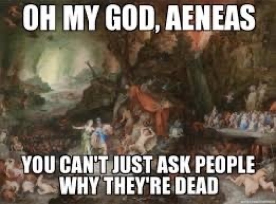 So you see it’s not just because he’s a super fan working with an out-of-pocket idea that gives Virgil to Dante as his guide through the realms of the dead. Dante’s Virgil is more of a throwback to the early Church version of the man: a poet imbued with knowledge of the underworld through Aeneas’ journey in the Aeneid, and a virtuous pagan granted special privileges by dint of his proclaiming of the coming of Jesus in Eclogue 4. But even in this less wacky iteration, the fabulous medieval Virgil shines through occasionally. Despite finding all of those Divine Comedy-as-self-insert-Dante-wish-fulfillment memes funny, I do acknowledge with the pedants that they are inaccurate. Dante is a sniveling mess in a lot of the Inferno and Purgatorio, and the only reason he makes it through is because Virgil is there: both as a correcting goad to Dante’s cowardice, and as a force endowed by God (via Beatrice) to literally beat back the darkness.