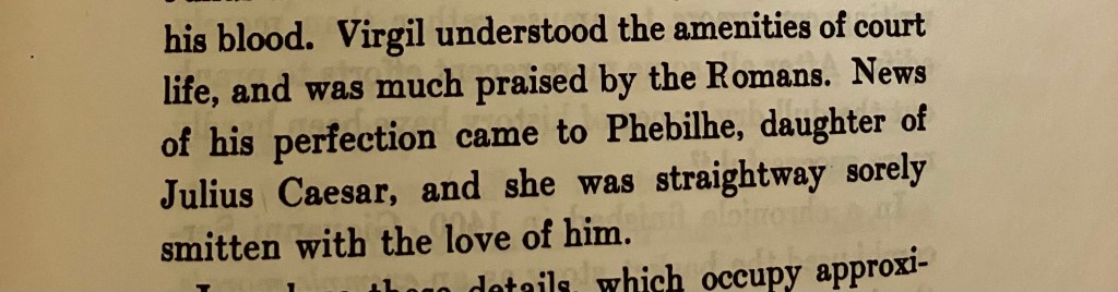 [Imagine being me and thinking that you had cooked up a really out-of-pocket idea about a daughter of Julius Caesar falling in love with Virgil, only to find out years later that you got lapped by some Belgian priest six hundred years ago…]
