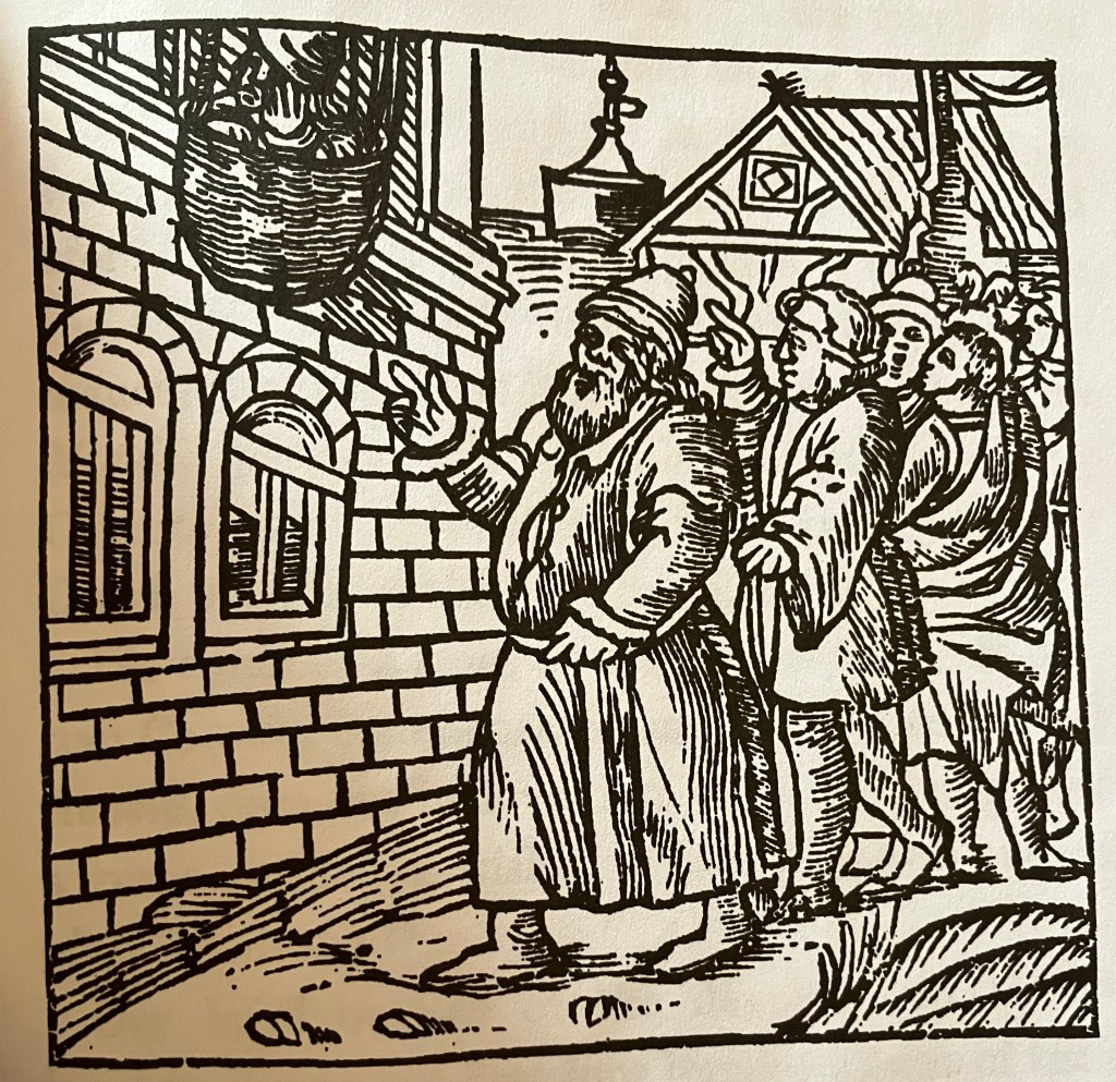 Speaking of Aristotle, he and Virgil also share a weird and dubious tradition in medieval literature as the victims of feminine treachery. In a variation on the Duped King trope, these two sorcerer-sages are brought down a peg by women in stories meant to both show a powerful/smart person outwitted by a “lower” person, and to misogynistically show the evil influence women can have even over those who should be most able to resist their wiles. The Aristotle story is about the philosopher warning his pupil, Alexander the Great, not to fall for the seductive Phyllis’ charms, while falling for her himself and allowing her to ride him like a horse. Virgil’s story is less fixed, with dozens of variations, but essentially he is tricked into a basket by a woman he is attempting to meet for an assignation: he is supposed to be raised/lowered in the basket to/from her room in a tower, but the lady leaves him hanging there overnight to be a figure of ridicule to the town in the morning.