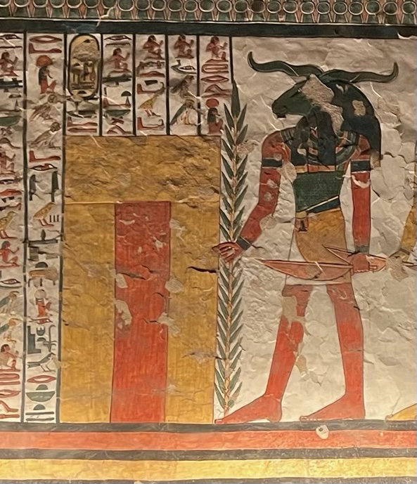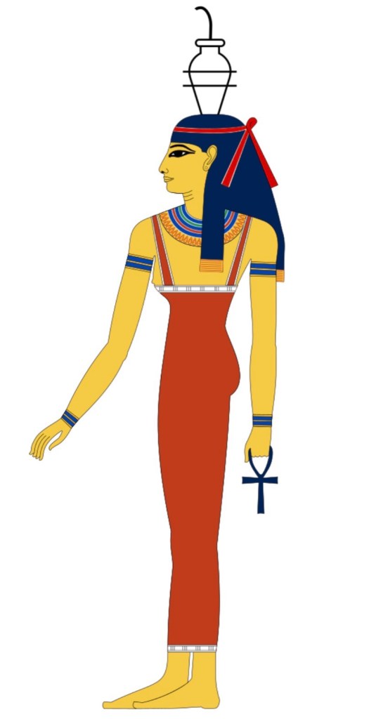 Oh, we’re not done with bodily fluids yet, folks. Luckily for all of you, though, Iat is the goddess of breast milk, which is at least perceptively cleaner. Her name likely comes from iatet, one of the Egyptian words for milk, and although we don’t know much about her, like the previously mentioned Heqet and Meskhenet, she made up part of the constellation of protective goddesses surrounding childbirth and childrearing. Most of her textual mentions come from the Pyramid Texts, where she is depicted as the wet nurse and foster-mother of the pharaoh, the giver of the divine sustenance that will allow the king to thrive in the afterlife. In the classic Wikipedia widget drawing above, it looks like her milk jug has a straw coming out of it. Though that would not be something unknown to the ancient Egyptians—they often drank their particulate-heavy beer through a filtering straw—I’m actually guessing that it is in fact a palm frond like the ones we saw with Heh. Indicating that Iat’s nourishment (or her ability to aid a mortal woman’s breast milk flow) is unending.