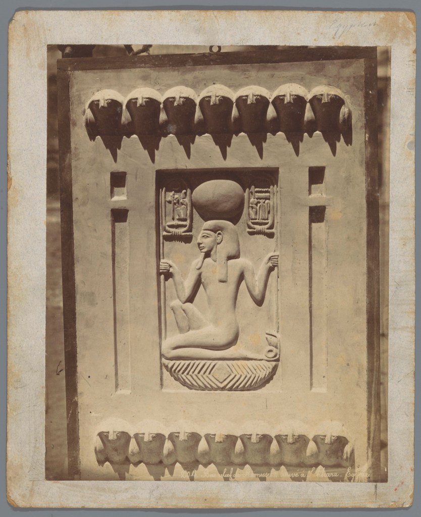 Heh’s name means “million(s),” and he is the personification of time and infinity. Like Nu, the god who is the watery chaos that birthed the universe, Heh—as Time Itself—is thought to have existed before existence was even a thing. Like the birth goddess Heqet, he is sometimes depicted with a frog’s head (a sign of birth and fertility), but generally I’ve always seen him shown as he is above: an anthropomorphic male deity kneeling in a basket (meant to represent the gathered “all-ness” of the universe), grasping two long palm fronds. The palm frond is the hieroglyph for “year,” the great length of Heh’s palm fronds is a visual symbol of the infinite time he represents. I know it’s a little hard to make out on this bas relief, but the right frond, as is often the case for Heh, is also shown sprouting from a frog sitting on a shen ring—the frog, as we mentioned, a fertility symbol, and the shen representing eternal protection (you’ve seen its stretched-out version forming the protective circle of a cartouche around a pharaoh’s name). Visually, this says that, protected by the infinite power of the shen, time will be endlessly renewed through the power of Heh’s hands.